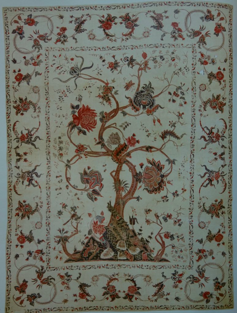 Die mit Abstand ältesten Beispiele für diese bemalten und bedruckten Baumwollstoffe haben sich in Indonesien erhalten (Kapitel 2). Hier war es der Gewürzhandel, der den Austausch von Material und Kultur begünstigte und es war der zeremoniale, gleichsam heilige Charakter der von weither importierten Sarongs und Wandbehänge, der ihren sorgfältigen Umgang und damit die Bewahrung eines unvergleichlich reichen Textilerbes ermöglichte. Die Sammlung Karun Thakar enthält hier eine beachtliche Gruppe deren früheste Exemplare radiocarbondatiert bis ins 13. Jahrhundert zurückreichen. Lebendige Jagdszenen mit Elefanten und Tigern oder reich gekleidete Gottheiten in Blockdruck mögen hier als Beispiele genannt sein.