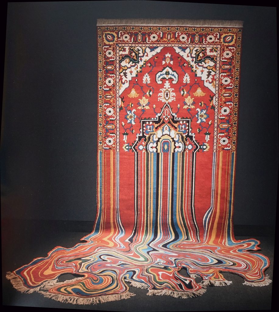 Auf diesem Nährboden wuchs ein Künstler heran, dessen Entwicklung und Werk nun in einer ausführlichen und reich illustrierten Monographie gewürdigt werden. Faig Ahmed, geboren 1982, lebt und arbeitet in der knapp 30 Kilometer südlich seiner Geburtsstadt Sumqayit gelegenen aserbaidschanischen Hauptstadt Baku. Er erhielt eine Ausbildung als Bildhauer an der staatlichen Akademie der Schönen Künste in Baku und vertrat Aserbaidschan auf der Biennale 2007 in Venedig. Neben Skulpturen, Videos und Installationen ist Faig Ahmed vor allem bekannt für seine surrealistisch anmutenden Textilskulpturen, die als Ausgangspunkt stets reale geknüpfte Teppiche mit traditionellen Mustern haben, die dann jedoch durch handwerklich visuelle Manipulation eine gewollt provokante zeitgenössische Erscheinungsform erhalten, sei es, dass sie zerfließen, gleichsam in ihre Grundfarben zerschmelzen, sich verpixeln oder durch überlagernde Muster verfremden. Der Künstler entwickelt seine Ideen und Visionen am Computer und realisiert sie dann mit einer Gruppe erfahrener Weber und Weberinnen am Webstuhl, wobei streng auf die Einhaltung traditioneller Knüpftechnik geachtet wird. Das Ergebnis sind immer überraschende, mitunter verstörende, oft ästhetisch beeindruckende Arbeiten, die traditionelles Kunsthandwerk und die Bildsprache von orientalischen Teppichen in ein zeitgenössisches Medium transferieren. Faig Ahmeds Werke interpretieren alte Handwerkskunst neu und eröffnen durch die Dekonstruktion von Traditionen und Stereotypen neue visuelle Landschaften. Seine Werke sind nicht der konzeptionellen Kunst zuzurechnen; sie sind ein eigenständiges Genre, eine unmittelbar wirksame ästhetische Provokation und ein Experiment zu physio- und psychologischen Mechanismen der Wahrnehmung.